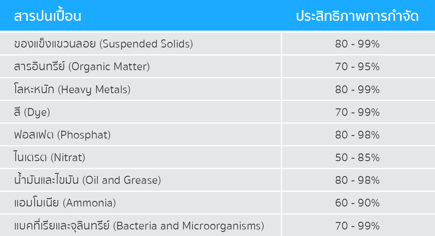 ตารางนี้จะรวมถึงสารปนเปื้อนหลักที่มักพบในน้ำเสีย และประสิทธิภาพการกำจัดโดยทั่วไป ที่ได้จากงานวิจัยต่างๆ
